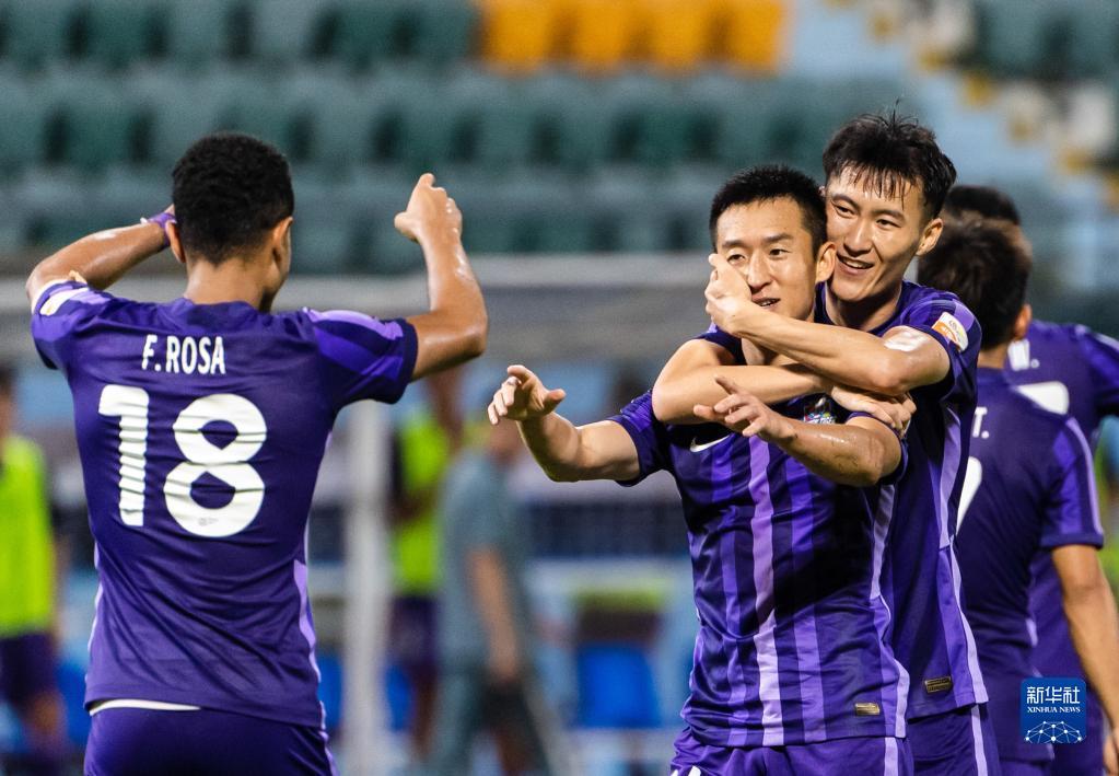 7月12日,天津津门虎队球员朴韬宇(左二)在比赛中庆祝进球。新华社记者 王冠森 摄