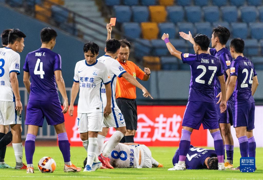 7月12日,主裁判王竞在比赛中向沧州雄狮队球员林创益(下左)出示红牌。新华社记者 王冠森 摄