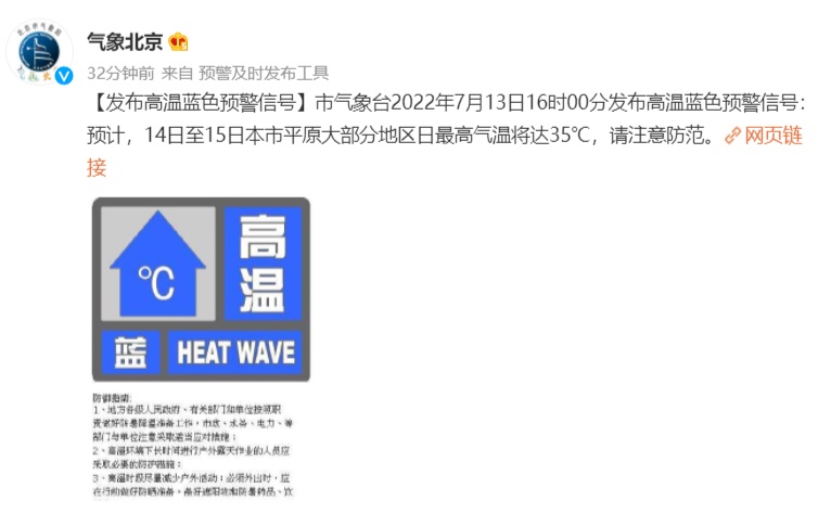 北京市气象台2022年7月13日16时00分发布高温蓝色预警信号:预计,14日至15日本市平原大部分地区日最高气温将达35℃,请注意防范。