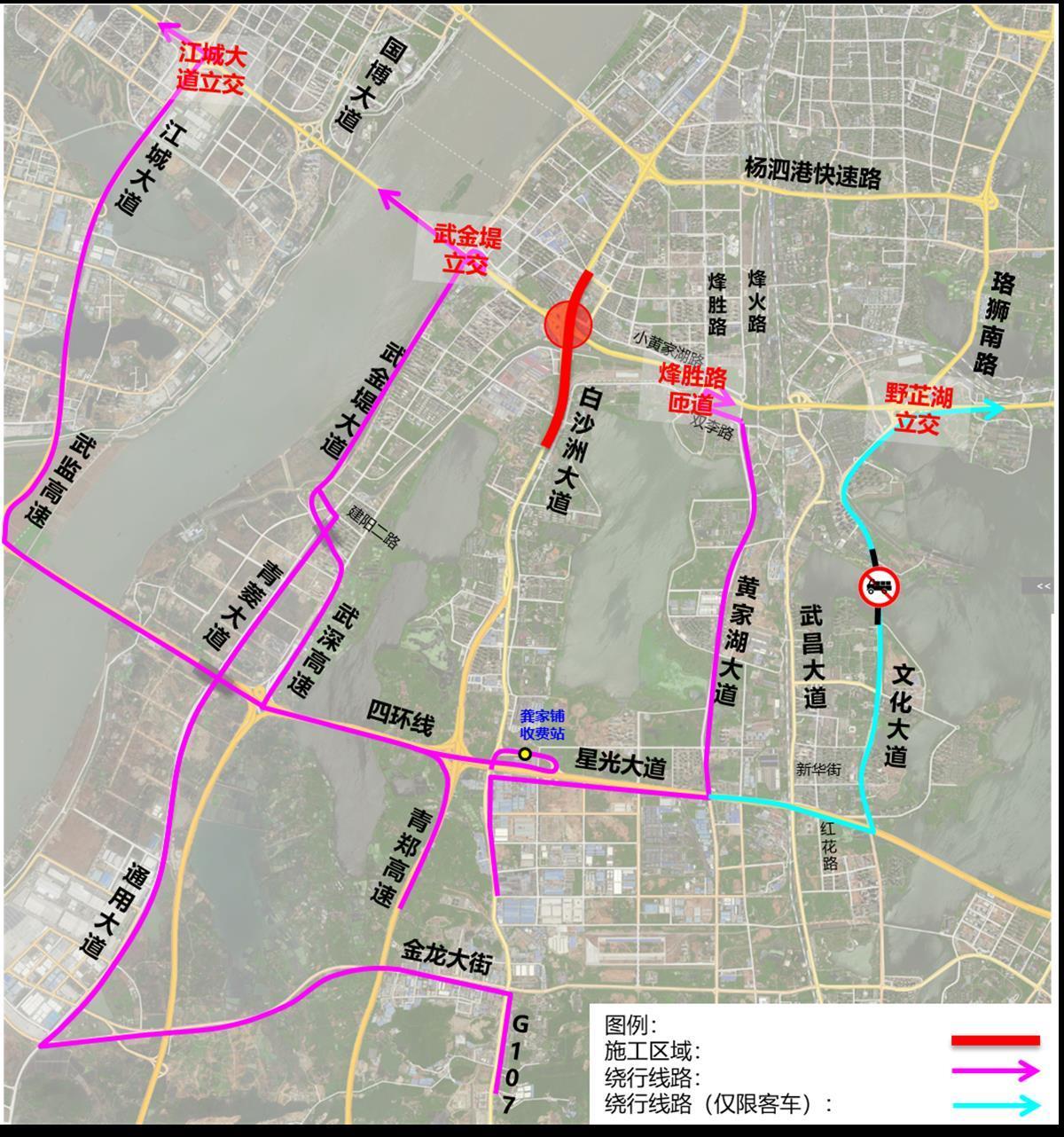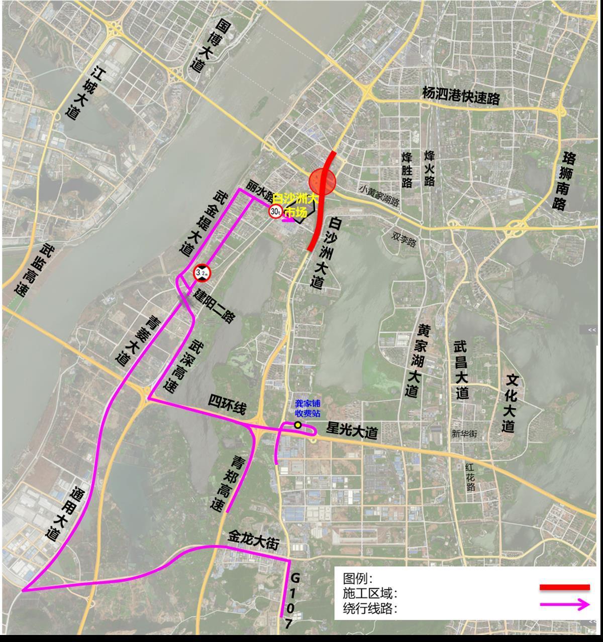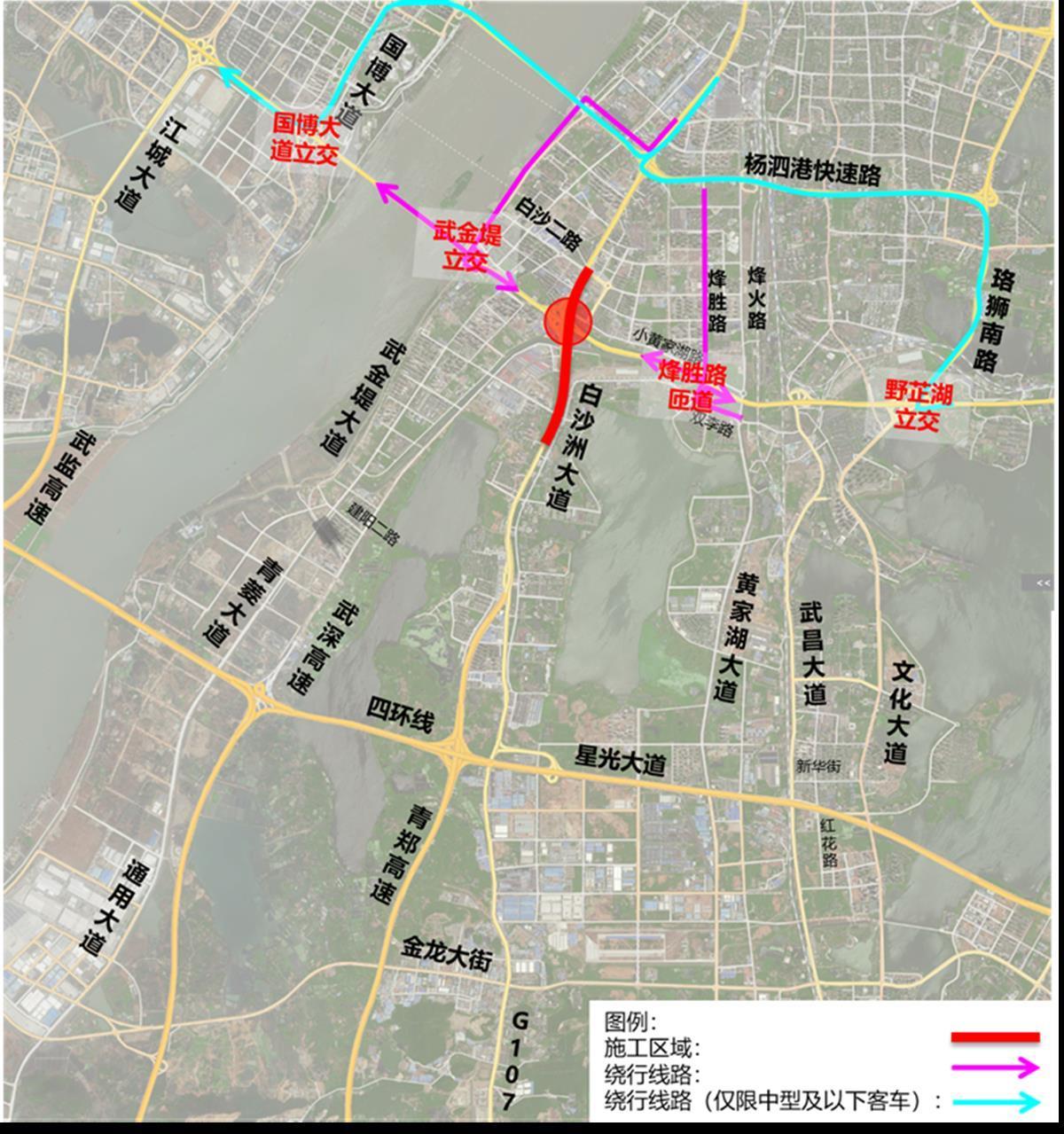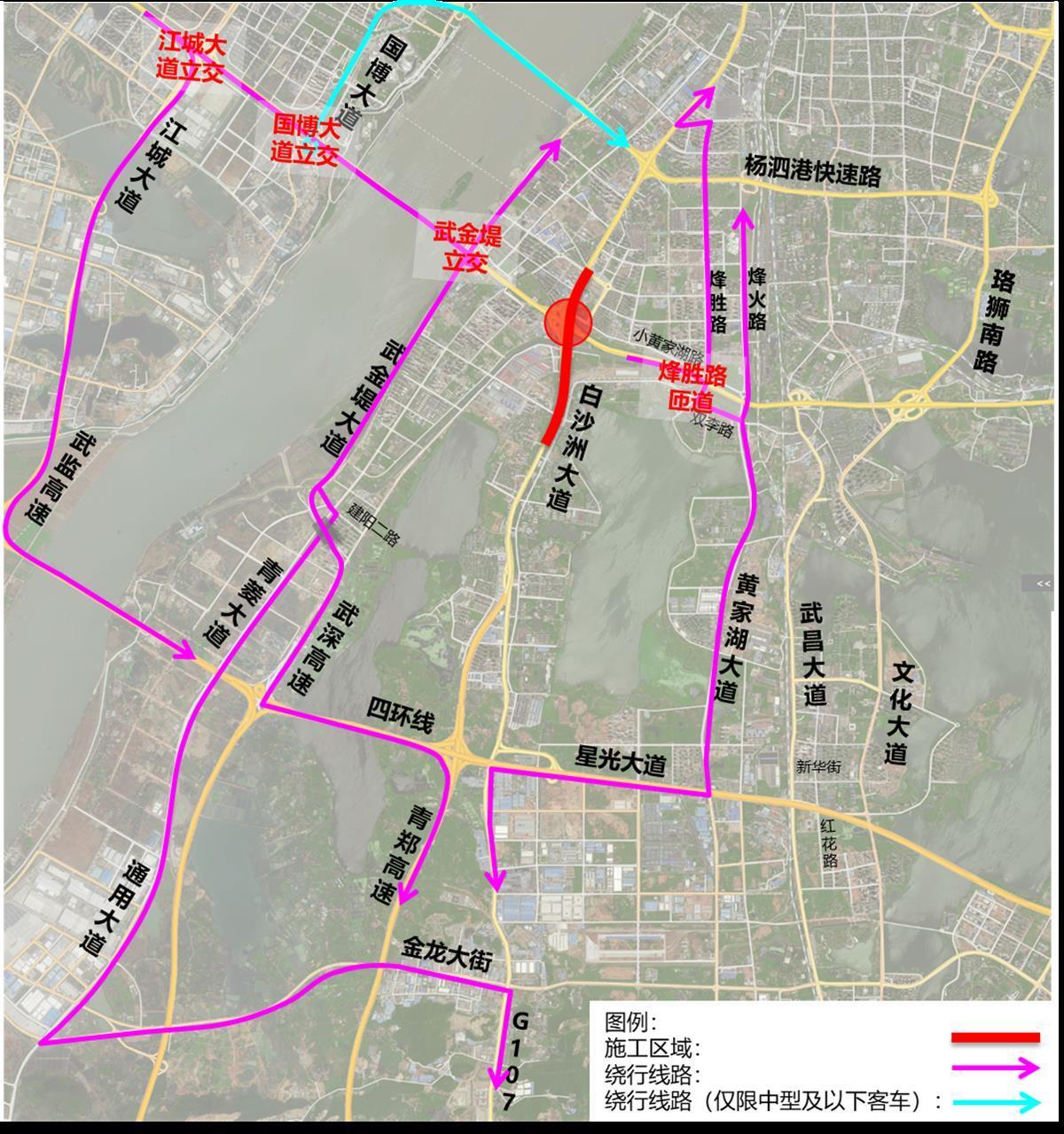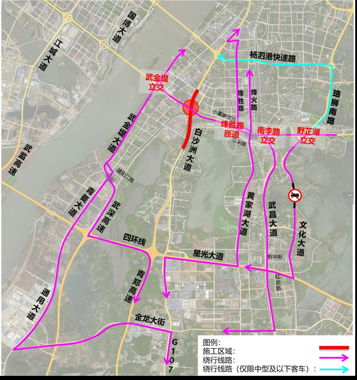 1、白沙洲大道武昌火车站往三环线方向车辆可通过楚祥大道绕行武金堤大道或烽胜路、三环线;