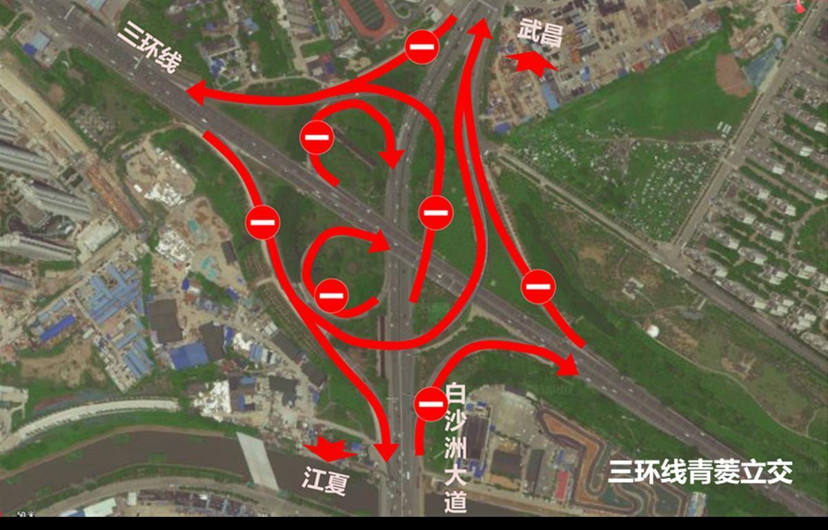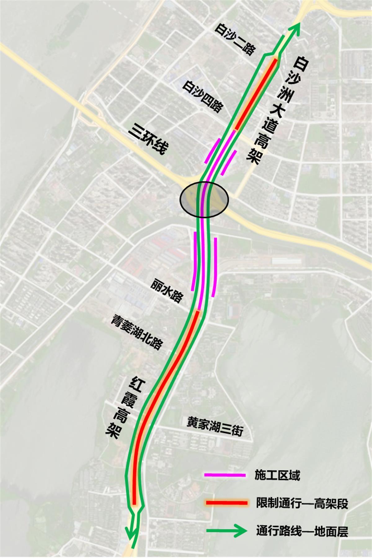 本次施工期间将拆除白沙洲大道高架白沙四路、红霞高架丽水路两处桥台,出城方向车辆一律在白沙二路匝道下高架,车辆在白沙洲大道(白沙二路至青郑高速段)一律通行白沙洲大道地面层。将同步封闭青菱立交所有匝道,机动车禁止通过青菱立交上下三环线。