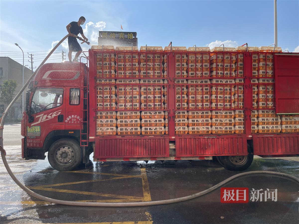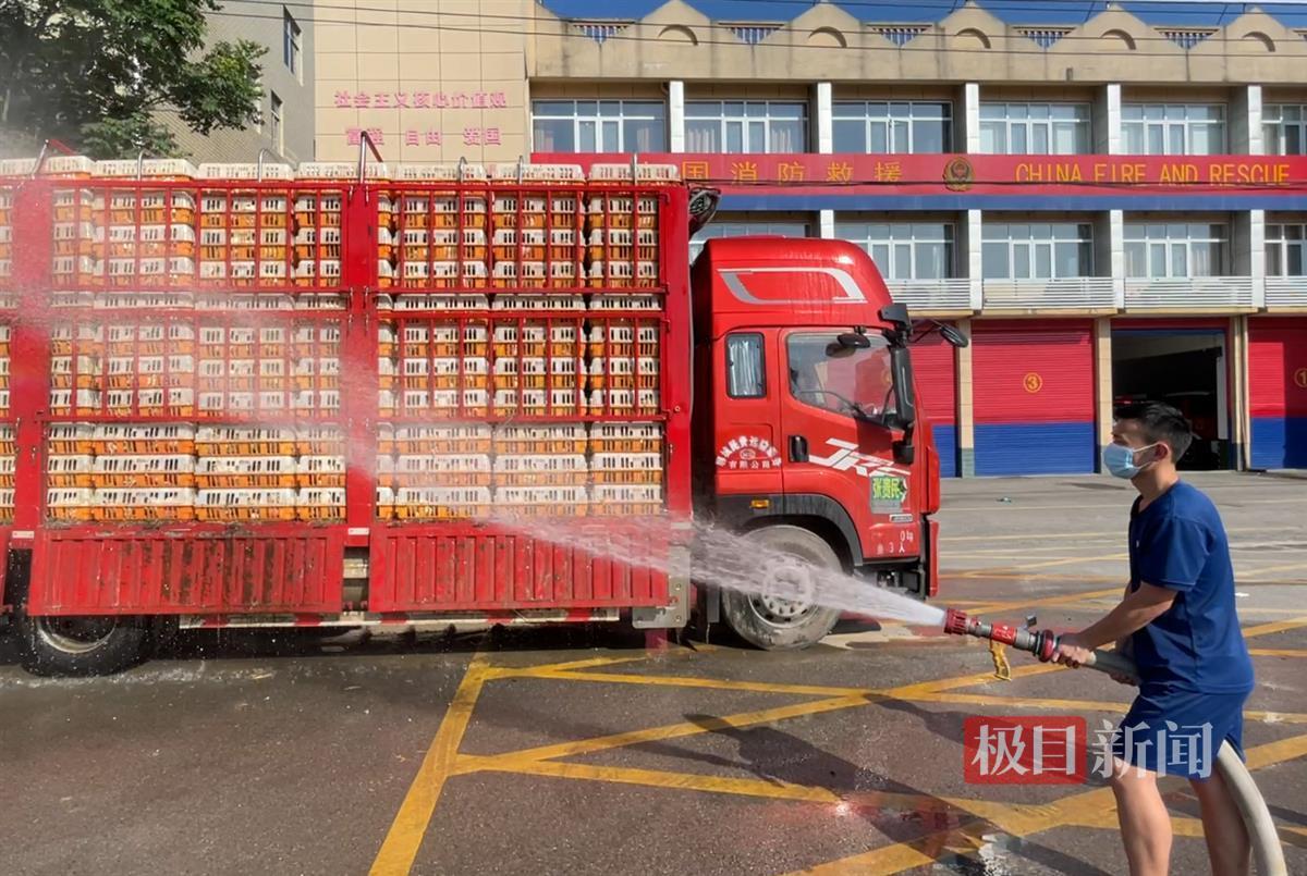 据悉,这辆大货车是安徽过来的,运的都是肉鸡,每只十多斤,价值10多万元,计划运到云南去,以前都是在高速服务区给鸡浇水降温,因当日气温高,又在疫情防控期,许多高速服务区不再给鸡浇水,这位外省的司机只好将车开到消防队求助。