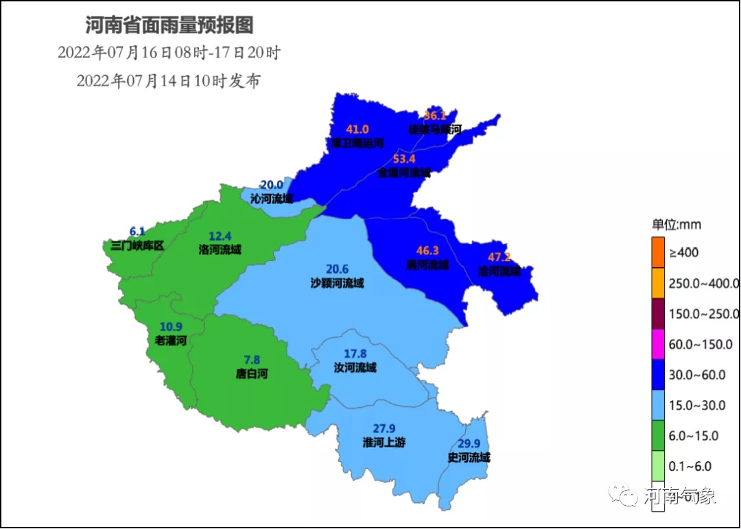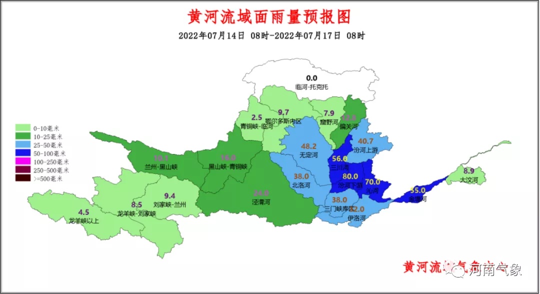 预计14到16日,黄河流域累计面雨量中游汾河下游、沁河流域70~80毫米,中游北洛河、无定河、三川河、汾河上游、三门峡库区、伊洛河和下游金堤河流域35~60毫米。