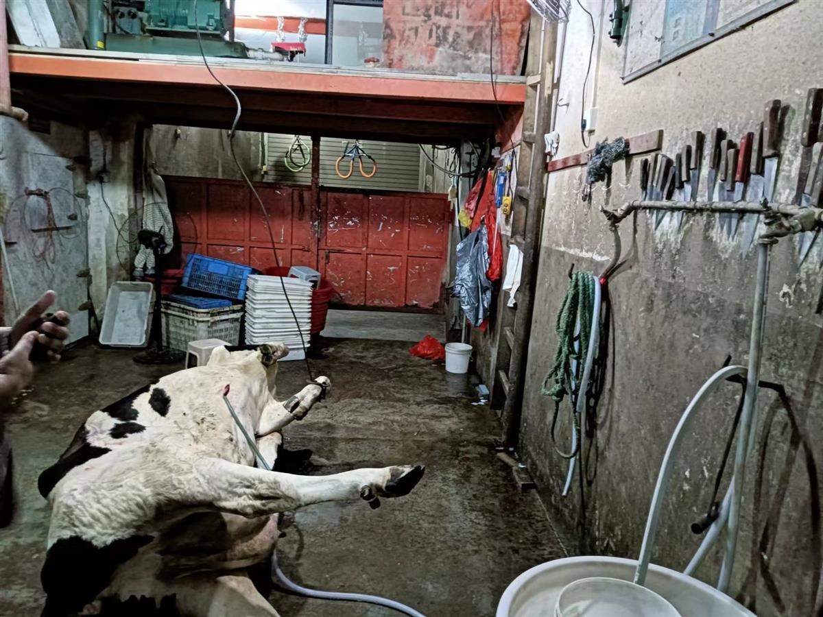 7月14日凌晨2点,咸宁市通山县市场监管局西城市场监管所执法人员在月亮湾农贸市场现场蹲点,将正在制作注水牛肉的贩子逮了个现行。现场,只见一头已经死亡的奶牛躺在地上,一根水管插入牛的胸口,正在往胃部灌水。