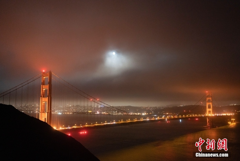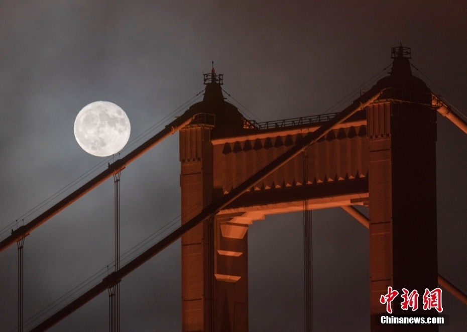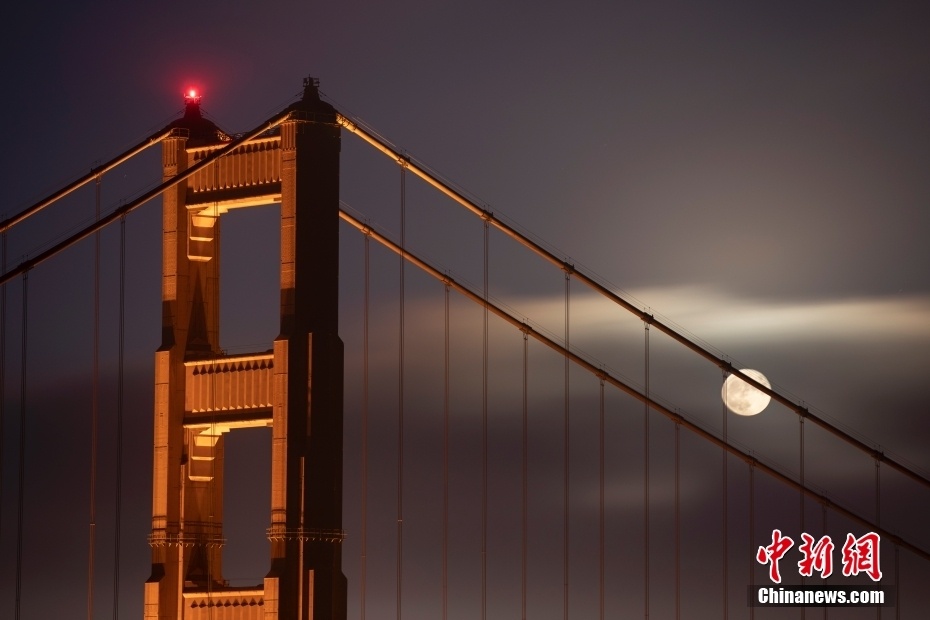 当地时间7月13日晚,2022年最大的“超级月亮”出现在美国加州旧金山上空,与金门大桥交相辉映。 中新社记者 刘关关 摄
