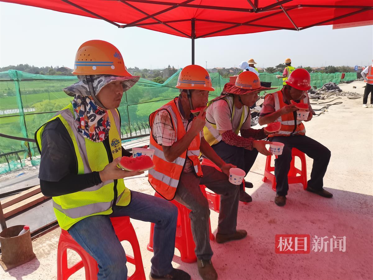 “项目部除每天定时给一线施工人员发放西瓜、矿泉水、酸梅汤、绿豆汤和仁丹、十滴水等防暑降温药品外,还将施工时间调整为上午6点至10点、下午3点半至7点半,尽量避开高温时段施工,做到安全生产两不误。”项目安全总监余延康说。
