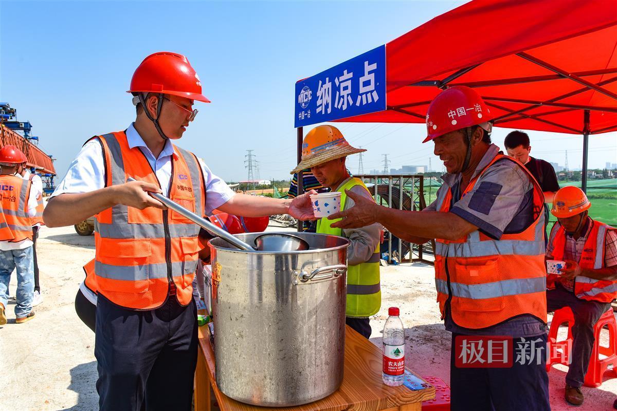 在当日的“送清凉”现场,来自四川广元的钢筋工何德勤向极目新闻记者表示,自己有两个女儿,大女儿已上大学,小女儿正读初中,从去年3月开始,就来到工地干活,出勤高的月份月薪超过万元。为防暑降温,何德勤将草帽“改装”粘在安全帽上遮阳。在休息区,屋内有空调。