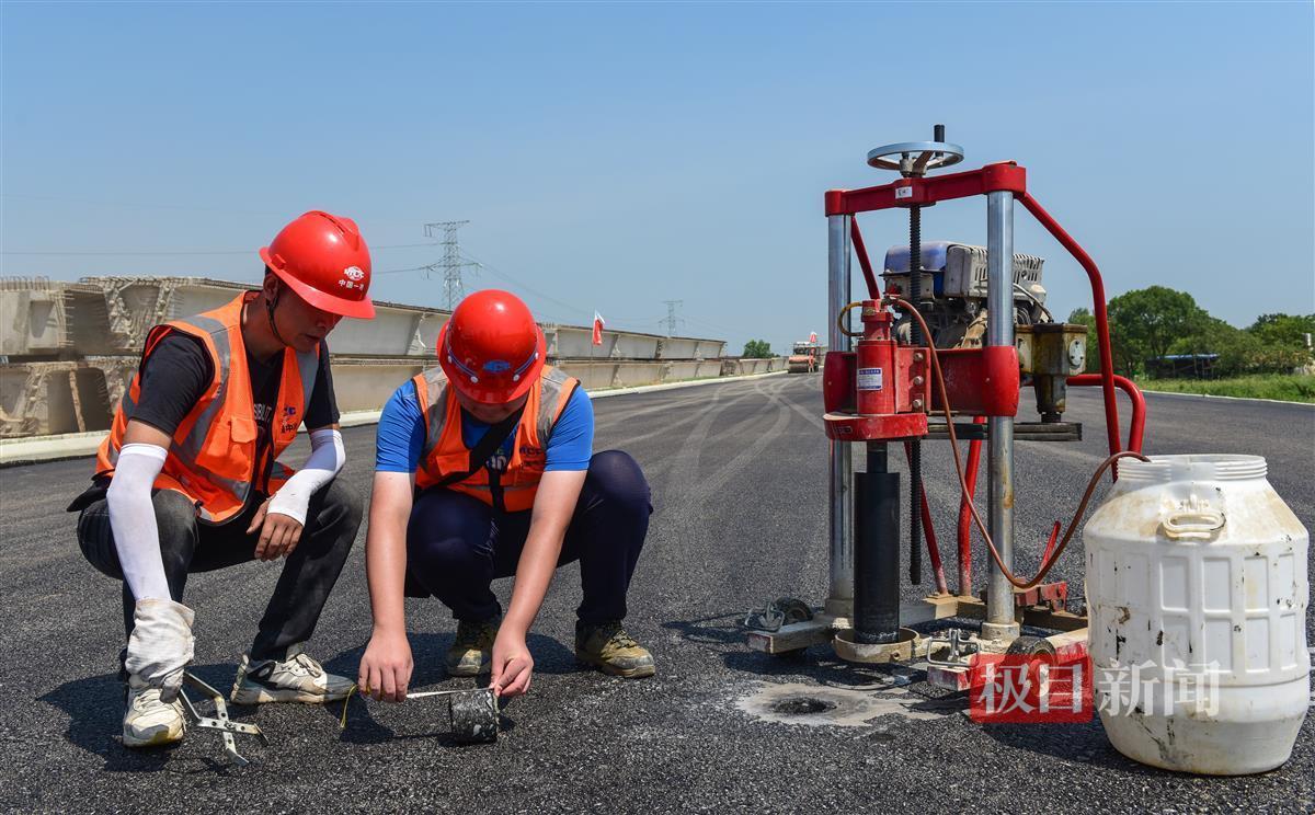 在主线郭王湾段,这里的试验段已进行路面沥青摊铺。质检员孙一凡和袁行在施工现场跟踪监测沥青的摊铺温度。极目新闻记者注意到,现场混凝土钻孔取芯机正对摊铺路面取样检测,查看摊铺厚实度等情况。