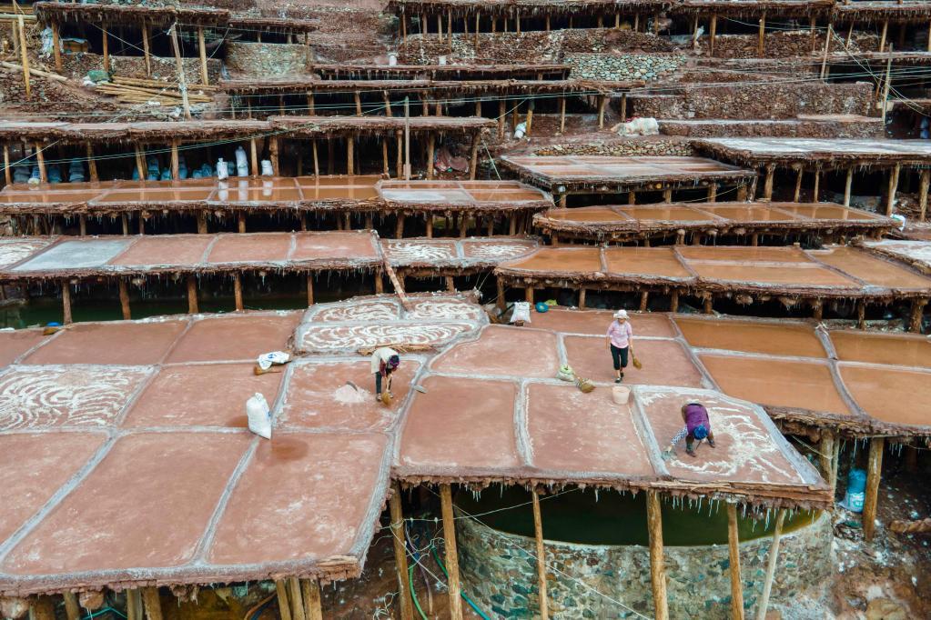 加达村村民在古盐田里劳作。新华社记者 陈尚才 摄