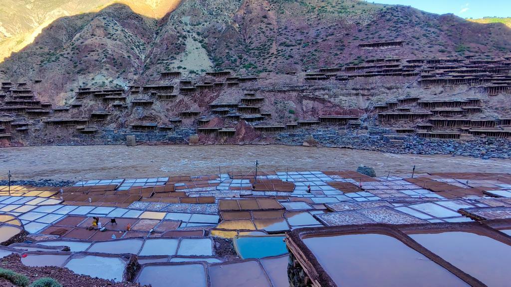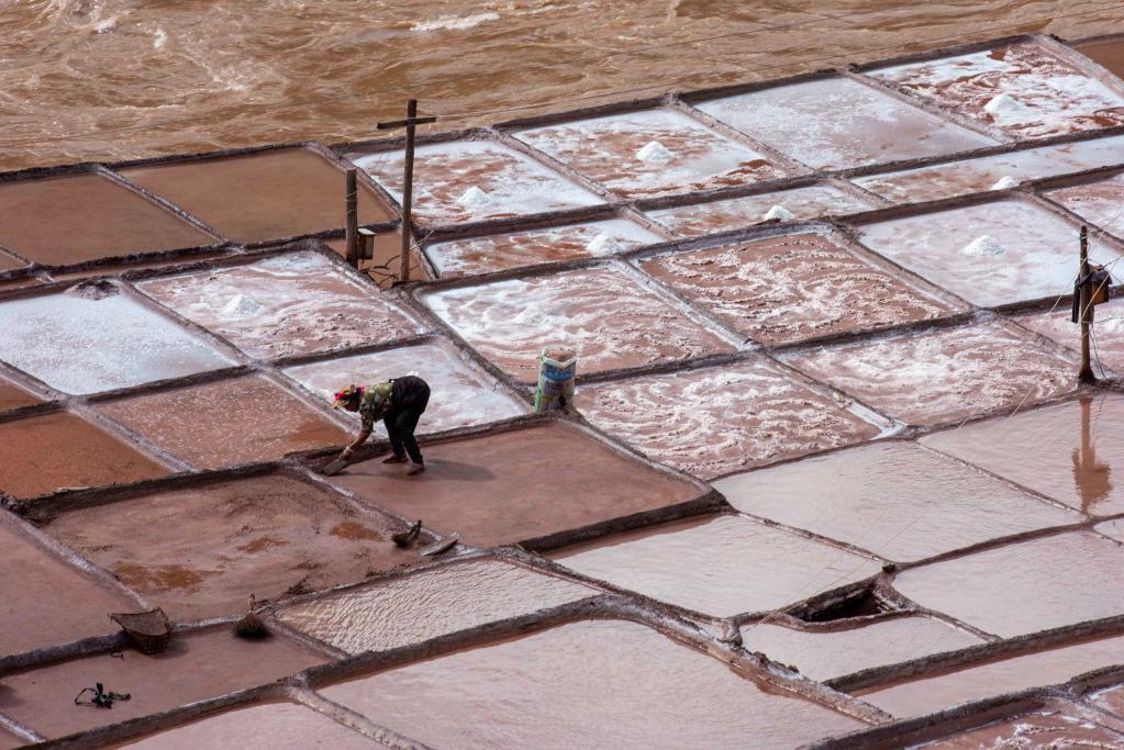 “3月到6月是晒盐的黄金时间,等到雨季来临,就不好晒盐了。”一大早,53岁的加达村村民美拉就来到盐田,开始了一天的劳作:从澜沧江畔的盐井抽取卤水到盐田,待风吹日晒后析出盐晶,再从盐田里刮出盐粒……