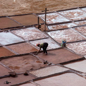 根据成色和用途,盐田一般可扫收三层盐,上面一层干净的白盐,一般可用作食盐烹饪食物;中间一层受黏土影响,盐粒变成红色,一般可作保健之用;下面一层盐粒颜色更深且有一定杂质,一般可用于饲喂牛羊。