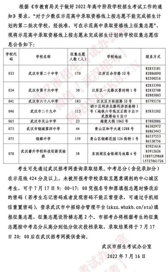湖北日报讯(记者张倩倩)7月16日下午,“武汉招考”官方微信公众号发布示范高中录取资格线上按志愿未完成招生计划的学校征集志愿信息,包括武汉市第二十中学、武汉市第十六中学、武汉市六十八中学等8所学校。中考总分(含优录加分)在示范线424分及以上,未被所报考学校录取且愿意调剂的中心城区考生可填报征集志愿。详细信息如下。