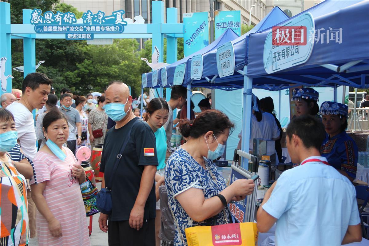 在本次专场推介会现场,不仅有身着土家服饰的阿哥阿妹令人宛如置身土家村落,金丝桐油、黄精酒、凤头姜等来凤县特产更是摆满了各个展台。在凉交会入口处,湖北酉来凤硒生态农业科技有限公司的展台前围满了前来选购的市民,公司工作人员欣喜地说:“本次专场推介会真的让许多市民了解了我们来凤县的特产,这不,才一小会儿我们就卖出去好几斤富硒茶了!”