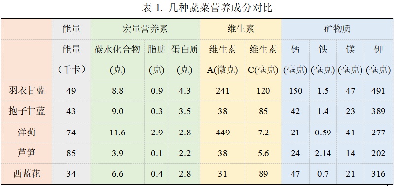 大家有没有发现,这些我们觉得特别清新脱俗的网红蔬菜们,在其主产区其实也只是民众日常食用的蔬菜而已,那它们的营养价值如何?看下面的表格就一目了然了:
