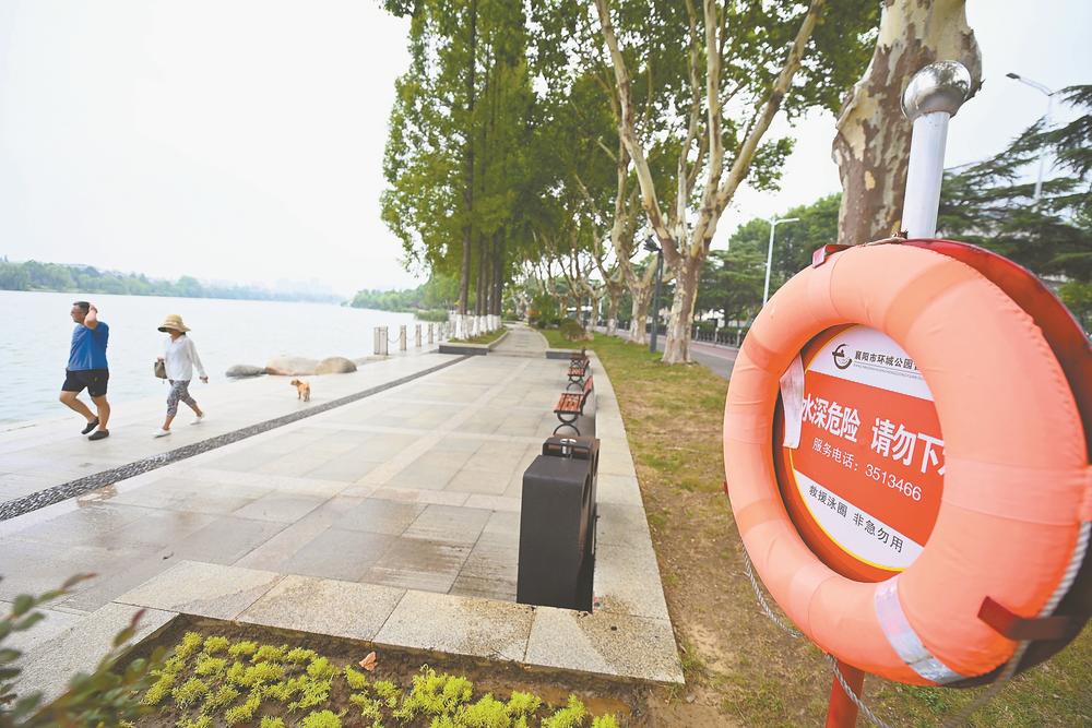 7月16日,市民从护城河边救生圈挂架旁走过。为营造安全的游玩环境,市住建局环城公园管理处在护城河文园、荟园段沿岸,每间隔100米设置一个救生圈挂架,共安放16套救生圈,方便对落水者及时施救,并提醒游人水深危险。