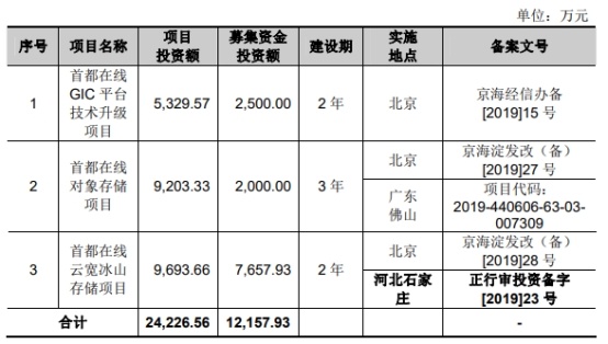 首都在线2020年6月17日发布的招股书显示,公司拟募集资金12,157.93万元,计划用于首都在线GIC平台技术升级项目、首都在线对象存储项目、首都在线云宽冰山存储项目。