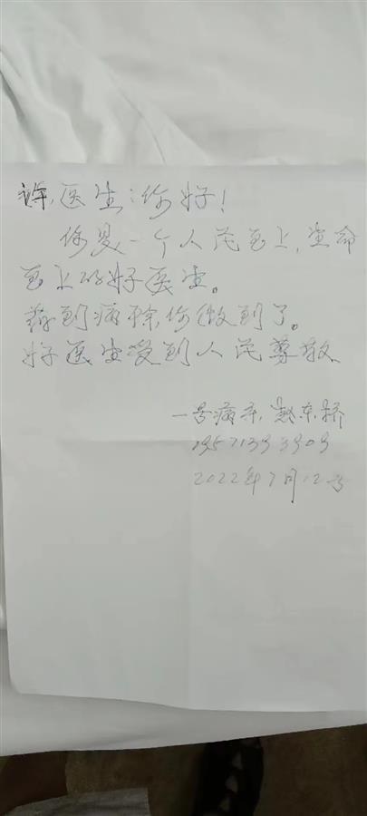 经过殷承英晓之以情,动之以理的开解, 有一定文化水平的黄婆婆认识到自己昨天太过激动,不仅主动配合检查,还手写了感谢信,与殷承英加了微信好友。