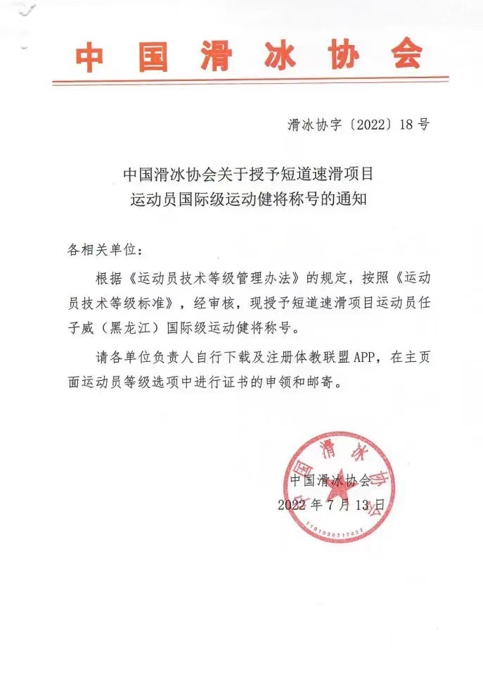中新网客户端北京7月18日电 7月18日,电中国滑冰协会官方发布公告,根据《运动员技术等级管理办法》的规定,按照《运动员技术等级标准》,经审核,现授予短道速滑项目运动员任子威国际级运动健将称号。