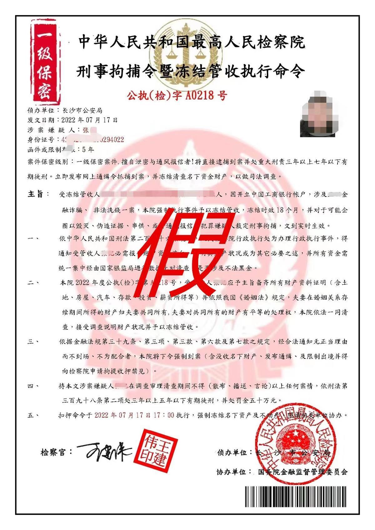 随后,对方通过微信向张女士发送了“刑事拘捕令”,看到“逮捕令”上出现了自己的姓名、身份证号码、照片等相关信息,回想起自己之前在外地确有办卡使用记录,张女士逐渐信以为真。