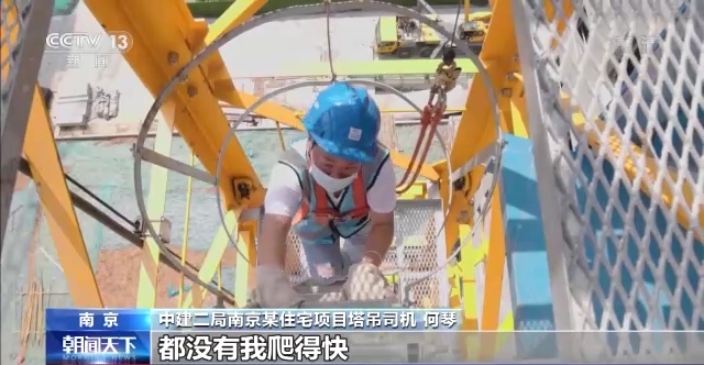 中建二局南京某住宅项目塔吊司机 何琴:暴晒后的爬梯还是比较烫手的,我们必须戴好手套攀爬。我干这行已经10年了,刚开始的时候爬得比较慢,现在好多男(塔吊)司机都没有我爬得快。干这一行还是比较累的,爬上去5分钟不到的时间衣服都得湿透。