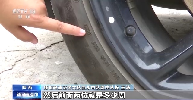 咸阳高速交警大队西永中队副中队长 王婧:大家上路前一定要检查好车辆的轮胎、制动、灯光等安全设施,而且要配备好三角警示牌。检查轮胎的时候大家要注意看这个花纹。如果说已经磨损到跟那个棱一样平了的话,是非常不安全的,要及时更换。另外一个就是轮胎上面有一个四位数,在这个圈圈里面,后面两位就是年份,前面两位就是多少周,如果已经使用了五年以上的话,就建议大家更换;如果长时间行驶的话,就要到服务区找一个安全阴凉的地方停车休息一阵,一是也可以缓解一下疲劳驾驶,二是让轮胎也休息一下。