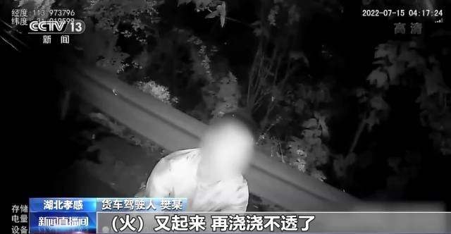 货车驾驶人 樊某:我拿了一罐水,给它浇灭了,我拿三角牌到后面去,等三角牌放好还没转过来,(火)又起来,再浇浇不灭了。