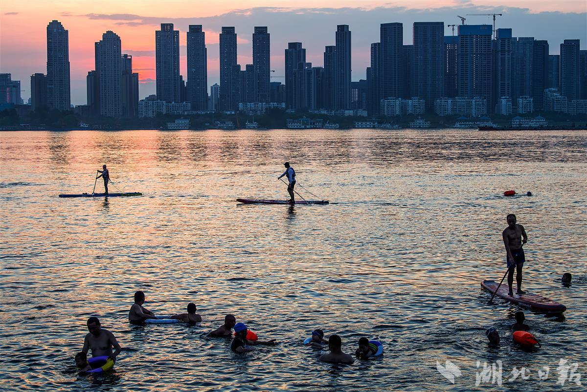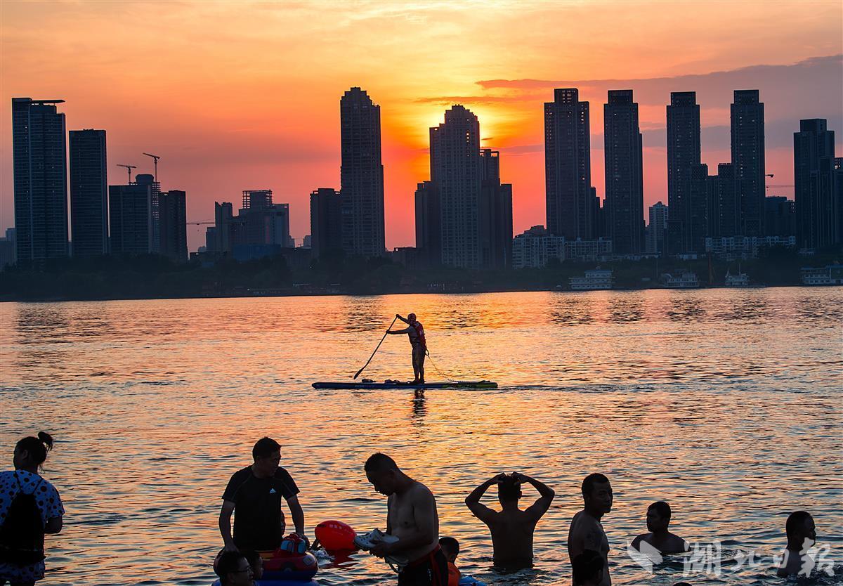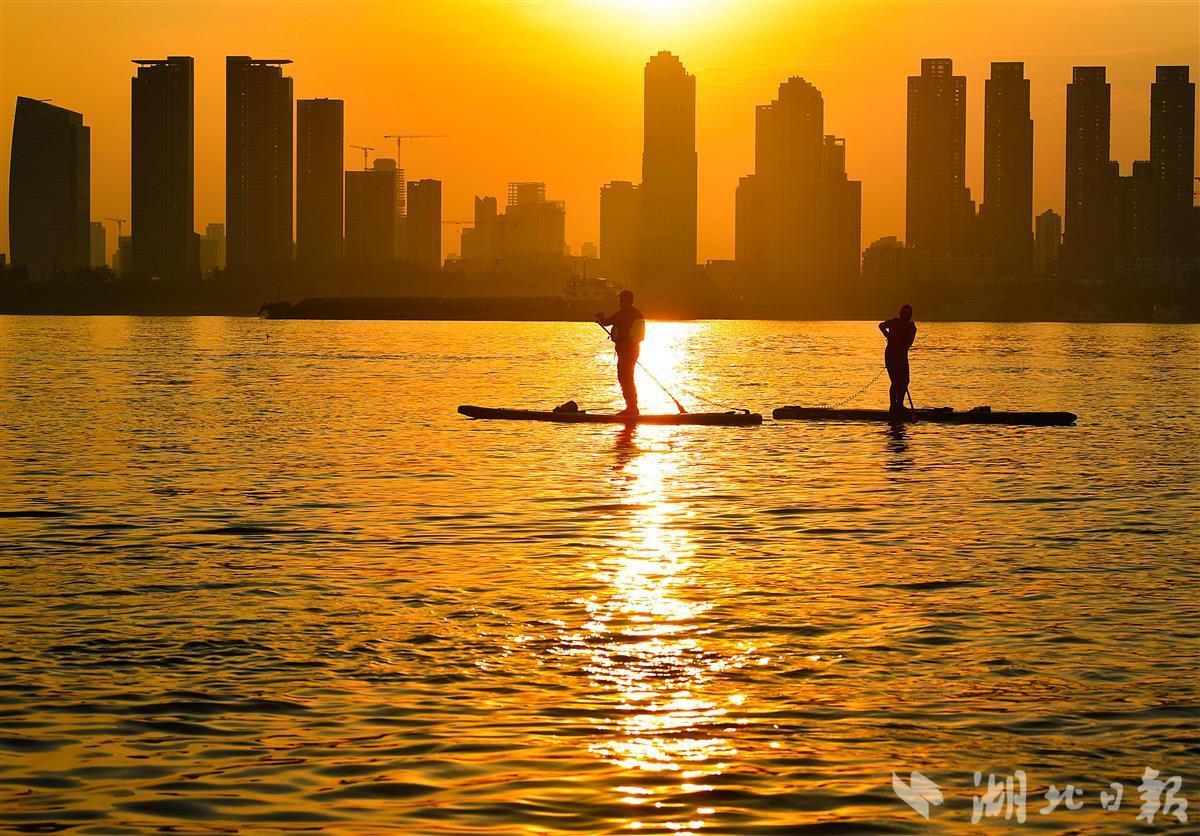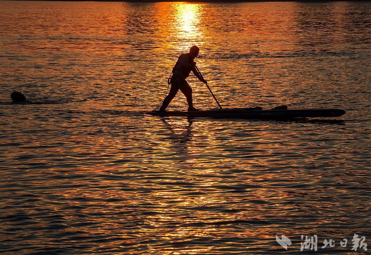 7月18日夕阳西下时,武汉江滩铁机路码头的长江上,冒出几名桨板运动爱好者,他们手里撑一支桨,脚下踩一块板,身体站直水上漂,一边吹江风一边赏夕阳,好飘逸。