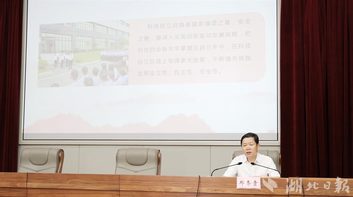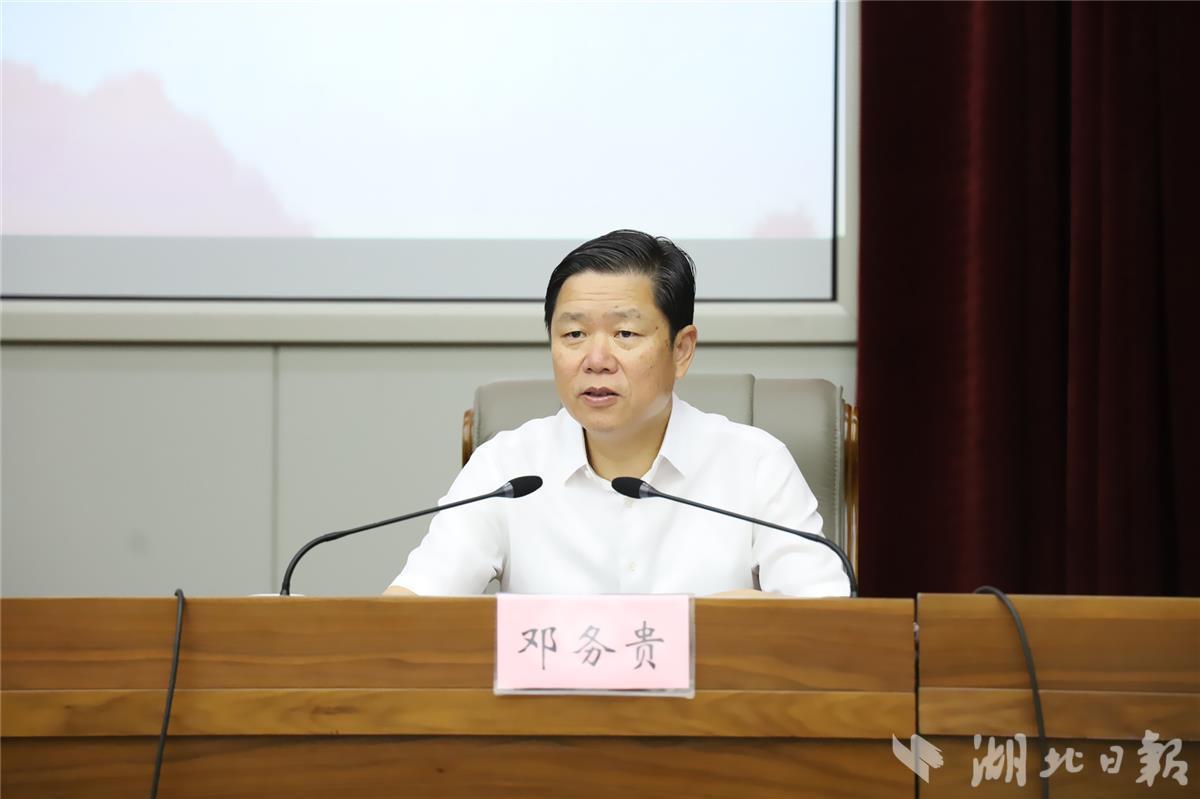 邓务贵以《牢记殷殷嘱托 为加快建设全国构建新发展格局先行区努力奋斗》为题进行宣讲。他以深刻领会习近平总书记考察湖北重要讲话精神开篇,深刻阐述了习近平总书记关于坚持以人民为中心的发展思想,以及关于科技自立自强、实施人才强国战略、统筹发展和安全、高效统筹疫情防控和经济社会发展、党建引领基层治理的重要要求。通过省党代会为什么要明确建设“先行区”的奋斗目标,湖北能不能建设“先行区”,要如何建设“先行区”,详细讲解了省第十二次党代会的重点内容、精神实质、深刻内涵。结合宣传思想文化工作,他说,要坚定文化自信,加快文化强省建设步伐,着力构筑精神高地,高质量发展文化事业,打造文化产业增长极,推进荆楚文化创造性转化、创新性发展,激发奋进新征程、建功新时代的强大精神力量,以文化为先行区建设铸魂塑形赋能。