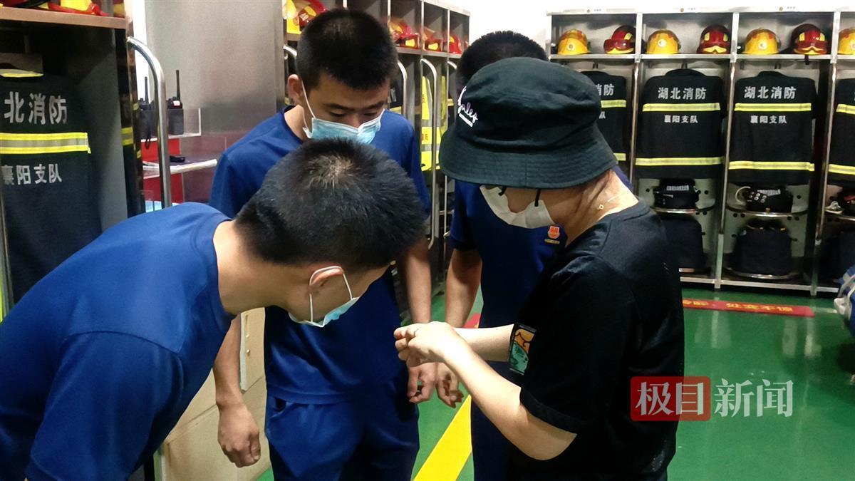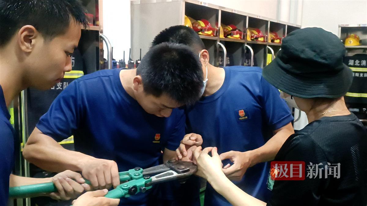 7月19日21时许,一对骑着摩托车的夫妇来到湖北襄阳市襄城区消防救援大队琵琶山路消防救援站,女子无奈地表示自己戴在手上的戒指卡住摘不下来了,尝试了好多方法都没用,只能来消防队上门求助。