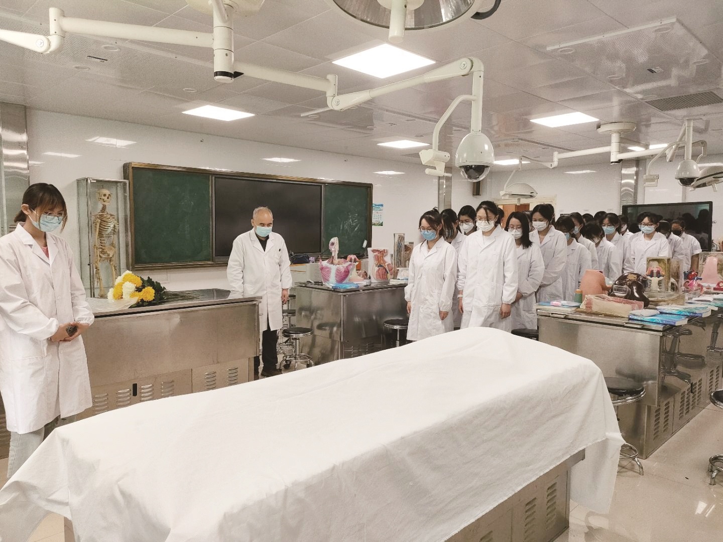 实验室里,20多名同学身穿白大褂,在听老师讲课。在老师讲完解剖的要点和方法后,解剖操作开始了。