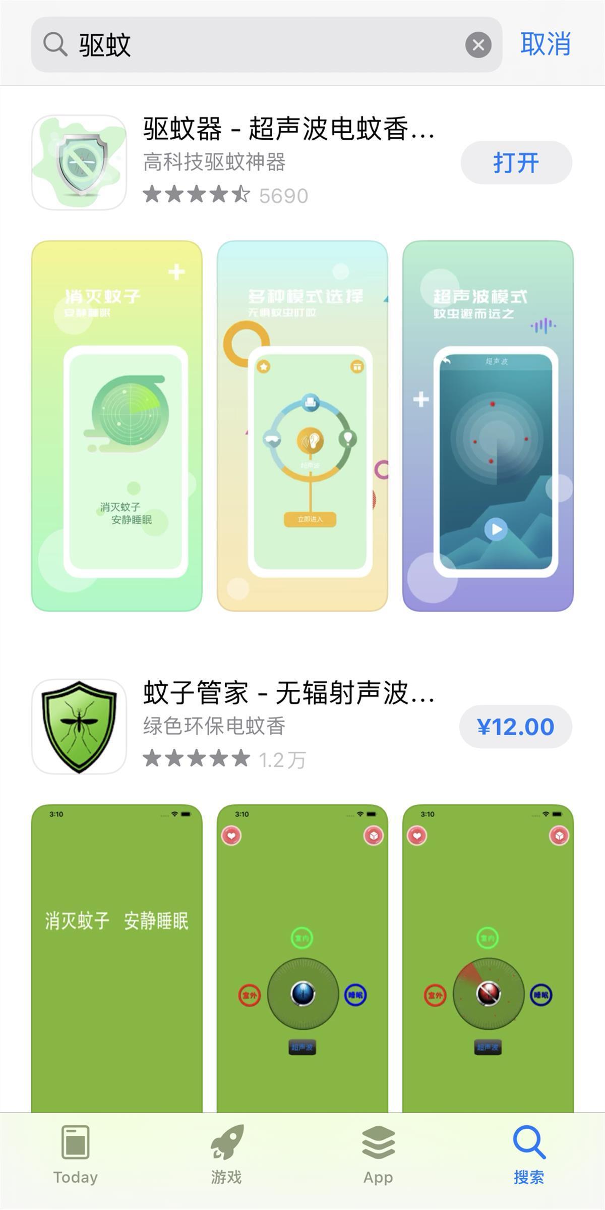 除了几款免费软件外,有一款软件需花费12元购买才能使用。该软件有1.2万个评论,评分高达4.9分,有网友称“打开以后发现没有蚊子了”“灭蚊效果不错”,还有网友表示“驱蚊的室内室外模式听起来非常刺耳”。记者仔细查看这些驱蚊软件的简介,发现这些软件宣称原理是利用超声波驱蚊。