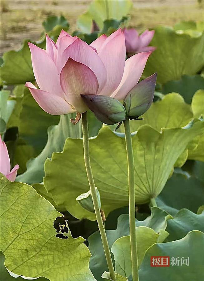 7月22日上午,位于孝感市云梦县下辛店镇梦南花海秀湖植物园,一株罕见的并蒂莲迎着阳光绽放,傲立池中,显得格外抢眼。