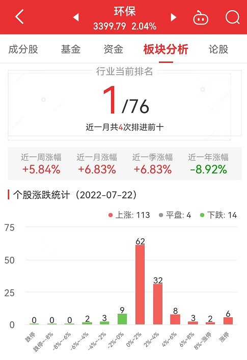 中国经济网北京7月22日讯 今日,环保板块整体涨幅2.04%,其中,113只股票上涨,4只股票平盘,14只股票下跌。