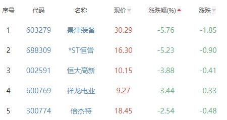 景津装备、*ST恒誉、恒大高新、祥龙电业、倍杰特位列涨幅榜后五位,涨幅分别为-5.76%、-5.23%、-3.88%、-3.44%、-2.54%。