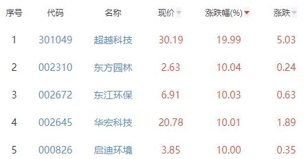其中,超越科技、东方园林、东江环保、华宏科技、启迪环境位列板块涨幅前五位,涨幅分别为19.99%、10.04%、10.03%、10.01%、10.00%。