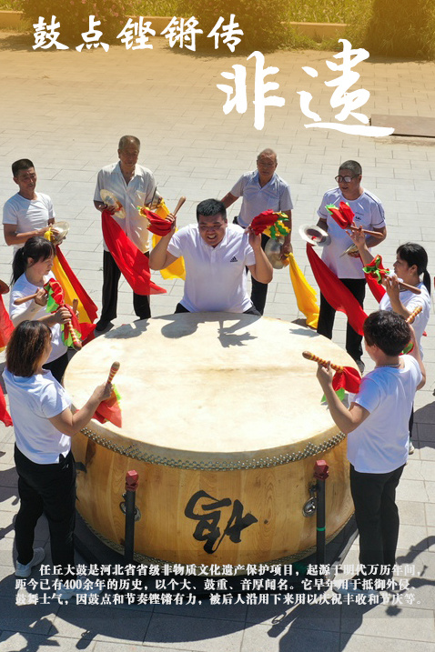 任丘大鼓是河北省省级非物质文化遗产保护项目,起源于明代万历年间,距今已有400余年的历史,以个大、鼓重、音厚闻名。它早年用于抵御外侵、鼓舞士气,因鼓点和节奏铿锵有力,被后人沿用下来用以庆祝丰收和节庆等,以表达内心的喜悦之情。