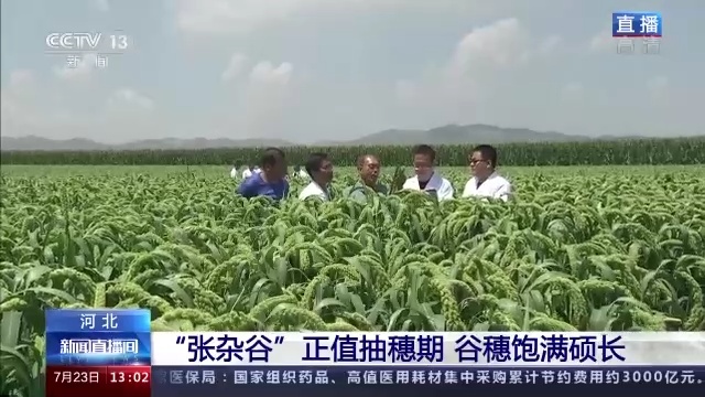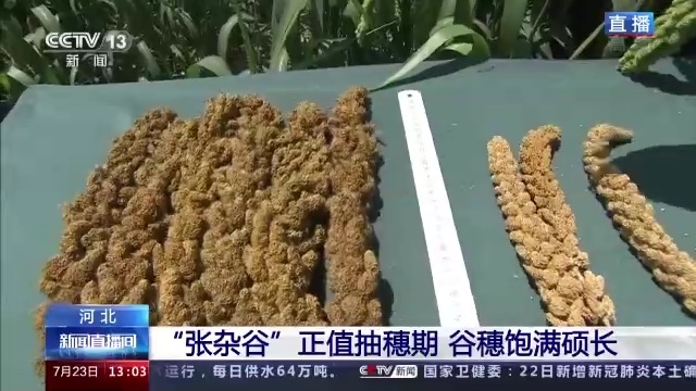 总台记者 王帅南:我现在正在蔚县的一处农田,我旁边是一片四十多亩的“张杂谷”。此时正是谷子的抽穗期,谷子谷穗饱满、硕长,长势良好,再有两个多月的时间,这片地里的“张杂谷”就要收获了。