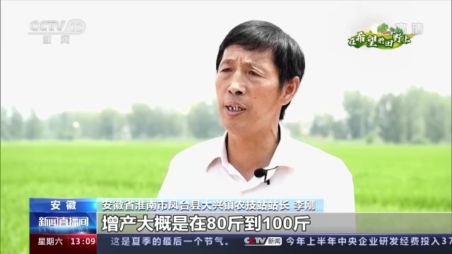 安徽省淮南市凤台县大兴镇农技站站长 李刚:当时我们测产的时候发现一亩地增产大概在80斤到100斤,由于用无人机飞防我们可以节约农药30%以上,一亩地节本大概是在50元左右,增效在100到120元。