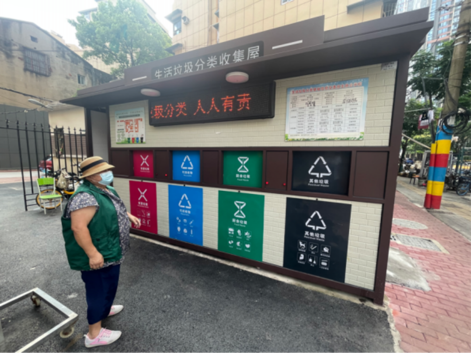 最初,他们在小区居民眼里是群“怪人”。大夏天他们站在闷热的垃圾投放点位里,盯着住户的垃圾袋,反复劝导:“垃圾要分类投放。”