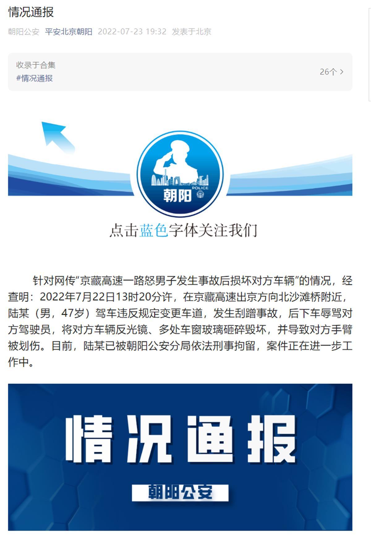 23日,北京市公安局朝阳分局微信公众号发布通报称,针对网传“京藏高速一路怒男子发生事故后损坏对方车辆”的情况,经查明:2022年7月22日13时20分许,在京藏高速出京方向北沙滩桥附近,陆某(男,47岁)驾车违反规定变更车道,发生刮蹭事故,后下车辱骂对方驾驶员,将对方车辆反光镜、多处车窗玻璃砸碎毁坏,并导致对方手臂被划伤。目前,陆某已被朝阳公安分局依法刑事拘留,案件正在进一步工作中。
