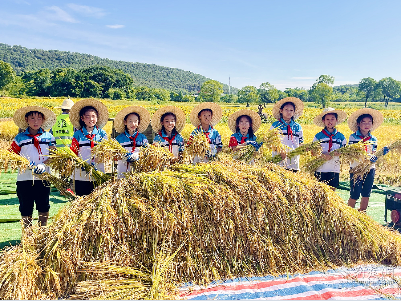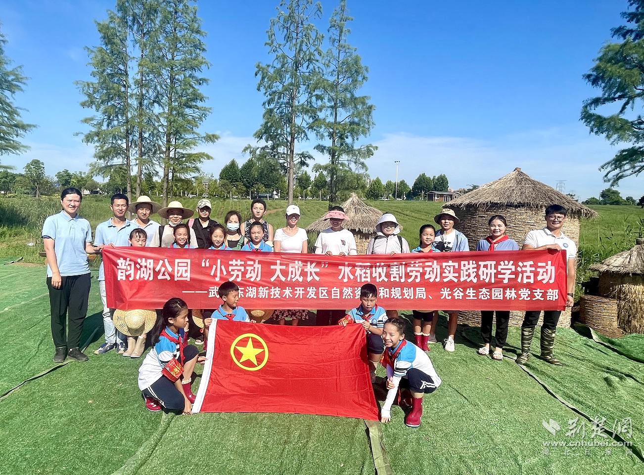 工作人员介绍,这整片花海在东湖高新区园林部门的指导下,由光谷建设公司打造,响应“三城建设”所提出来的“向往之城”的建设理念,提供市民郊游休闲的好去处,提升居民幸福指数,从今年起引入农耕文化的公益活动。在芒种节气,一批优秀学生代表亲自体验传统农耕文化,插下秧苗,经过3个月的茁壮成长,绿油油的秧苗变成了金灿灿的稻谷。本次这场收割稻谷的研学活动是今年举办的第二场,再次邀请到第一场活动中亲手插下秧苗的优秀学生代表来到现场,尽情感受丰收的喜悦。