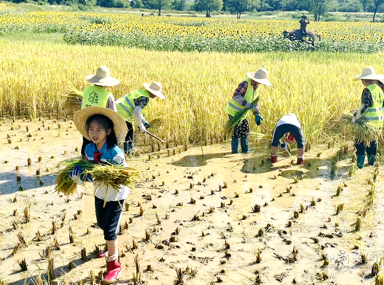 同学们左手抓水稻,右手拿镰刀,热情的干劲,挥动的镰刀,一束束稻穗在欢声笑语中被收割,虽然天气炎热,同学们仍忙得不亦乐乎,看着一捆捆的稻谷,他们脸上洋溢出收获的喜悦。“通过这次实践,我体会到了农民伯伯的辛苦与不易,但是也收获了劳动的快乐。回去后,我要更加珍惜每一粒粮食!”研学现场,来自华师一附中光谷汤逊湖学校四年级的陈喆同学说。此刻,他脸上沾着泥巴,衣服已被汗水浸湿。