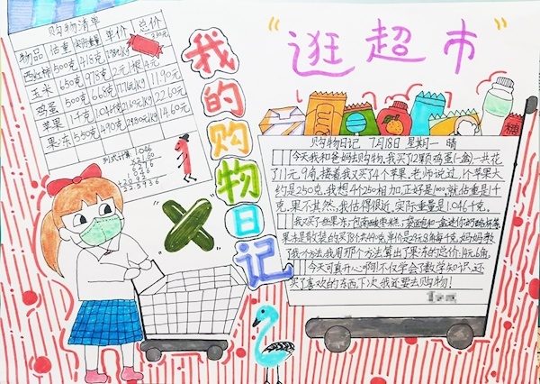 这份作业对不同年级的孩子,有不同的难度。一年级学生以“模拟购物”为题,通过在家中模拟生活用品、学习用品的“买卖”场景,认识和使用人民币,夯实数学加减法运算,并在每一次的货币交易中真切感受“花钱”的分量和爸爸妈妈赚钱的不容易。
