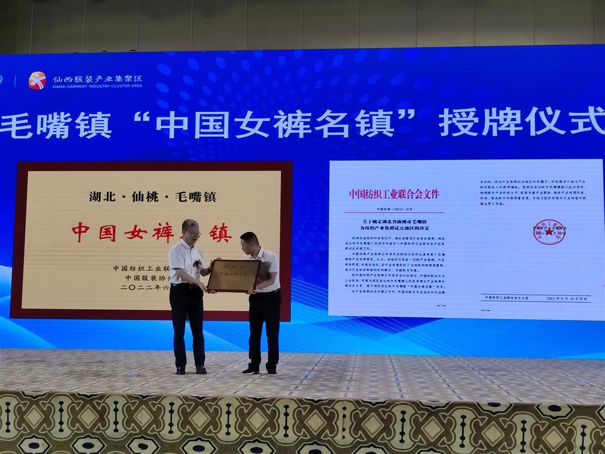 2021年,仙桃市毛嘴镇向中国纺织工业联合会提出了共建产业集群试点的申请。经省经信厅、省服装行业协会共同推荐,中国纺联产业集群工作委员会按相关程序认真考察了毛嘴镇的产业发展情况,中国纺织工业联合会同意与仙桃市毛嘴镇开展产业集群试点共建工作,并授予湖北省仙桃市毛嘴镇“中国女裤名镇”称号。