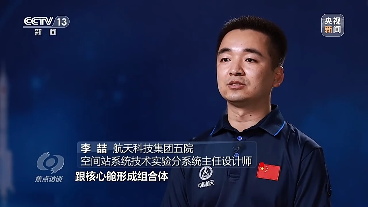 航天科技集团五院空间站系统技术实验分系统主任设计师 李喆:问天舱大概不到18米,相比核心舱从长度上来讲稍微长点,跟核心舱形成组合体,活动空间从一个大开间变成两个大开间。