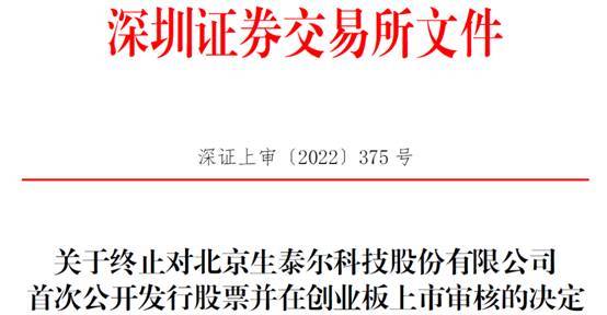 2022年7月20日,生泰尔向深交所提交了《北京生泰尔科技股份有限公司关于撤回首次公开发行股票并在创业板上市申请文件的申请》,保荐人中信建投证券股份有限公司向深交所提交了《中信建投证券股份有限公司关于撤回北京生泰尔科技股份有限公司首次公开发行股票并在创业板上市申请文件的申请》。根据《深圳证券交易所创业板股票发行上市审核规则》第六十七条的有关规定,深交所决定终止对生泰尔首次公开发行股票并在创业板上市的审核。