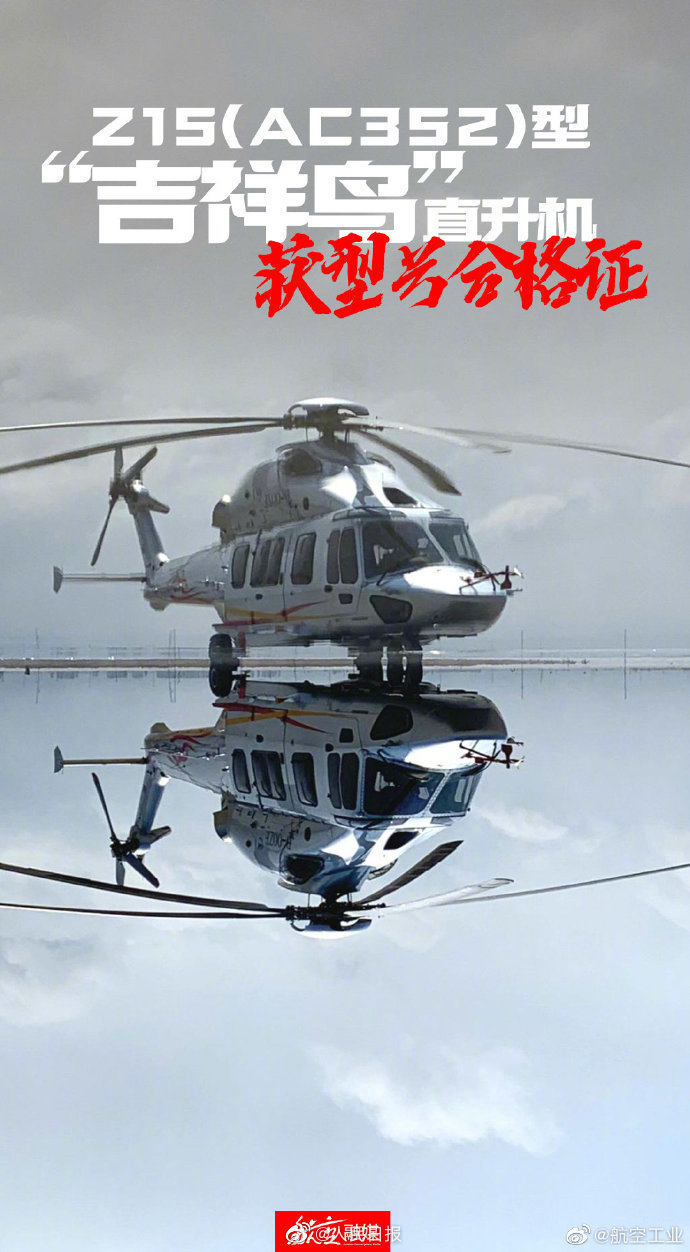 吉祥鸟直升机来了!26日,中国民用航空局向航空工业哈飞颁发了AC352直升机型号合格证,标志着该型直升机研制工作取得圆满成功,具备了进入国内民用市场的条件。AC352直升机是一款国产中型多用途民用直升机,最大起飞重量7.5吨,最大航程850公里,可搭载16名乘客,可广泛应用于搜索救援、人员运输、医疗救护等领域。