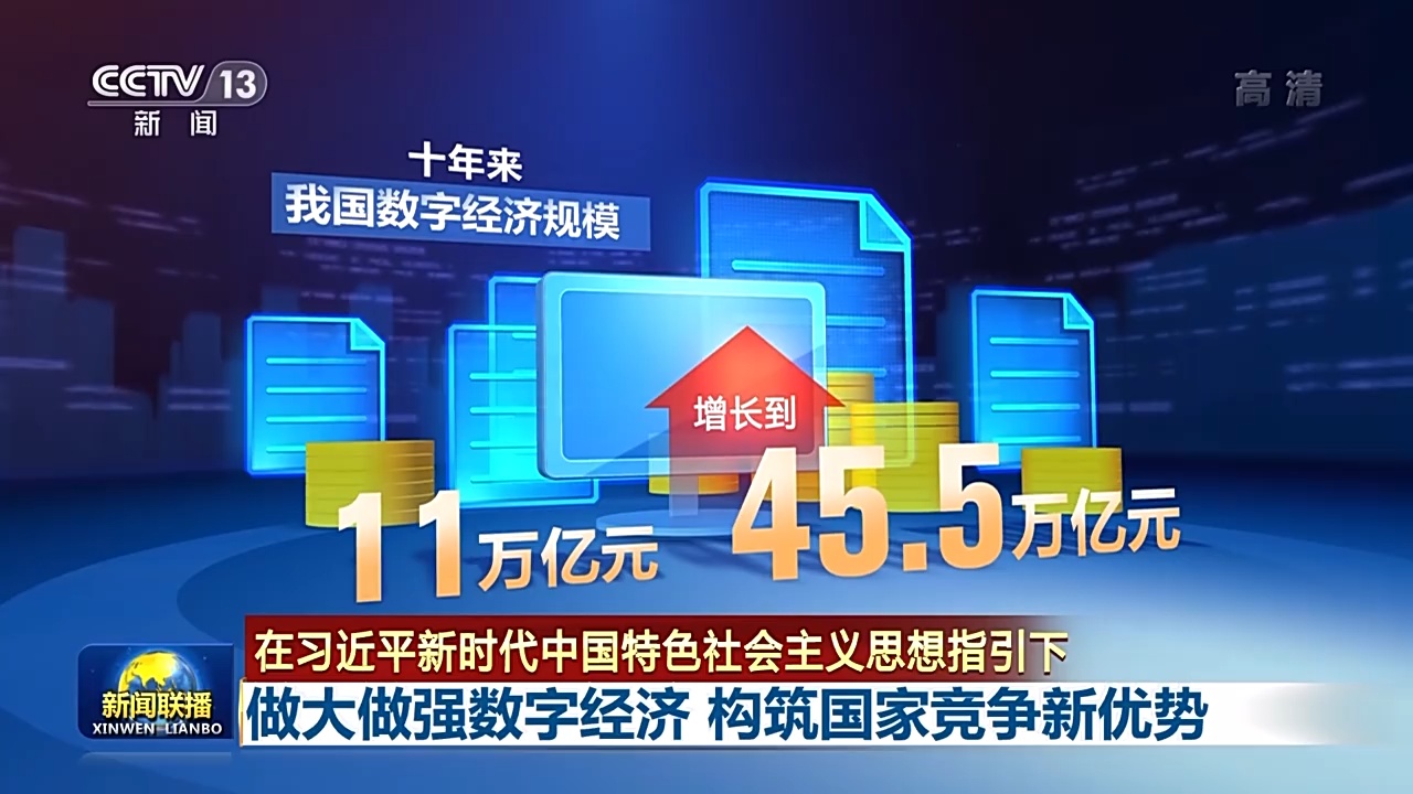 十年来,我国数字经济规模从11万亿元增长到45.5万亿元,数字经济占国内生产总值比重由21.6%提升至39.8%。我国数字经济规模连续多年位居全球第二,其中电子商务交易额、移动支付交易规模位居全球第一,一批网络信息企业跻身世界前列,新技术、新产业、新业态、新模式不断涌现,推动经济结构不断优化、经济效益显著提升。