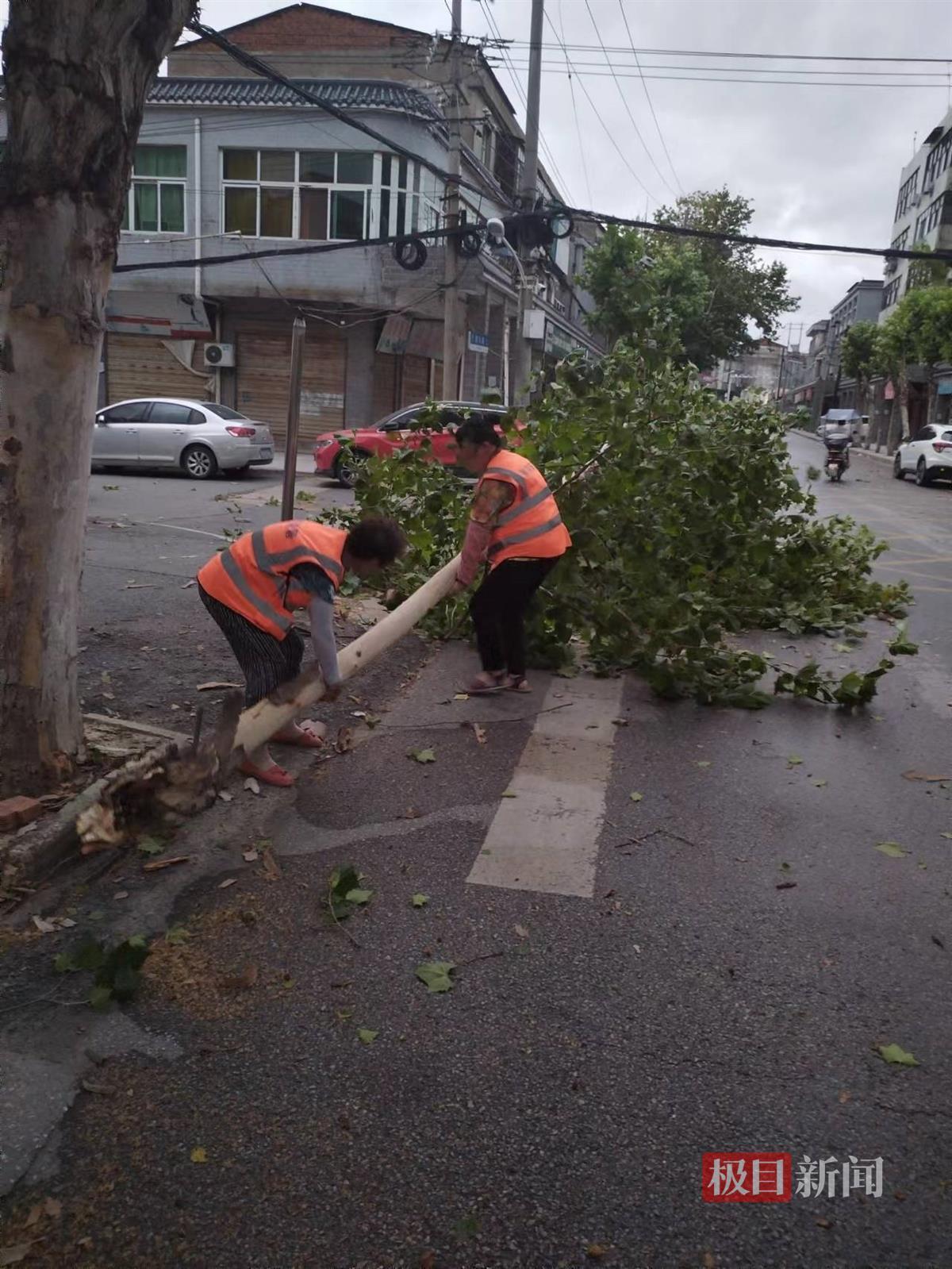 7月26日早上,狂风暴雨来袭,武汉市东西湖新沟镇街西马路上一棵大树木被吹倒在马路上,影响交通通行。两名环卫女工合力将大树抬到路边,清除了路障。
