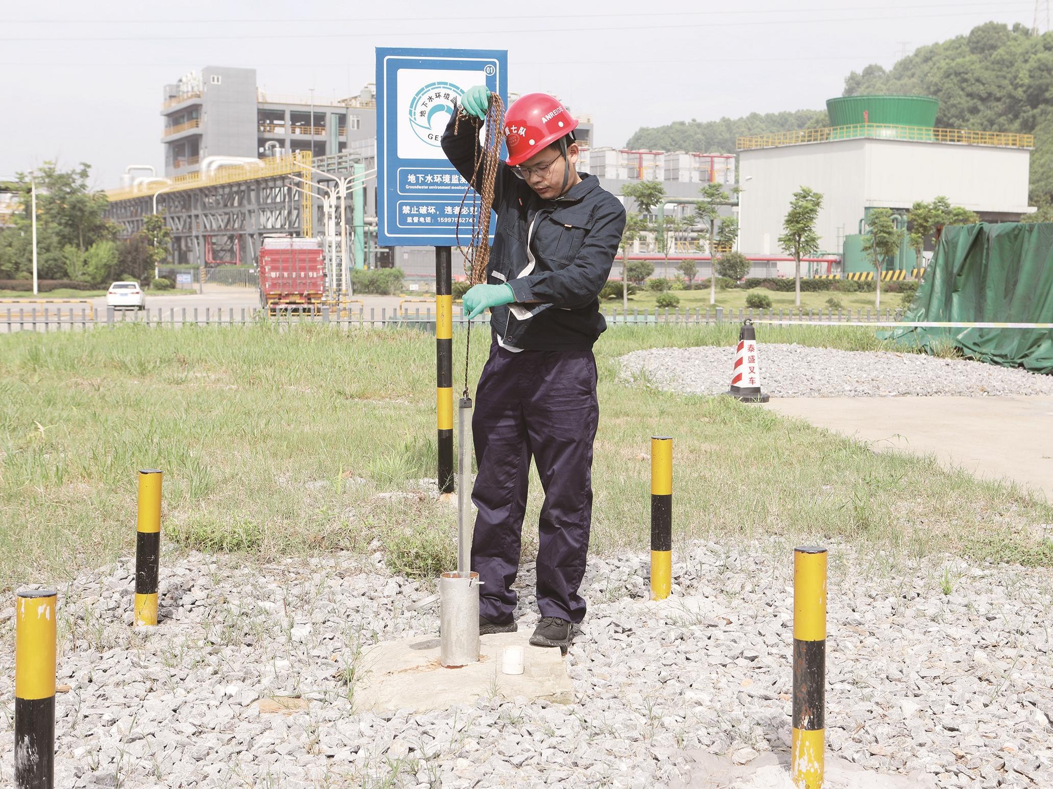 蒋达源从泰盛化工有限公司1号地下水环境监测井内现场取水测验。 阮维佳摄